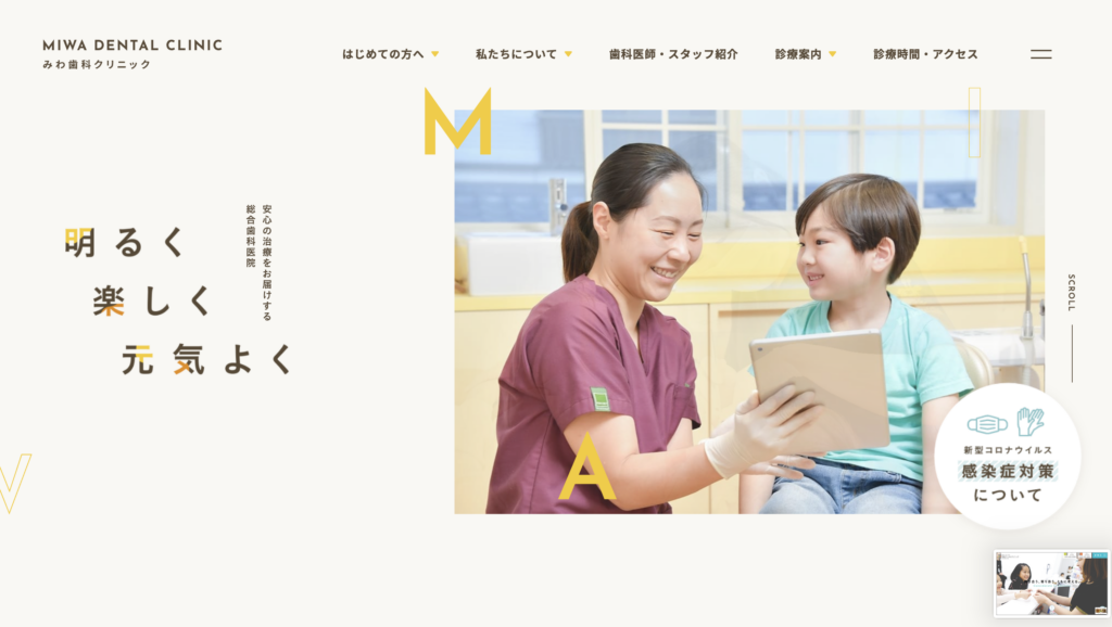 「明るく、楽しく、元気よく」という医院のモットーが、画面全体から伝わってくるデザインです。