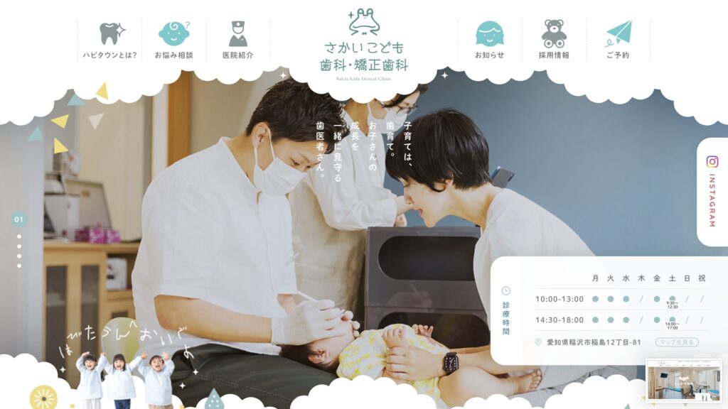 パステルカラーの優しい色使いと親しみやすいイラストが、お子様の「歯医者さんは怖い」というイメージを払拭します。