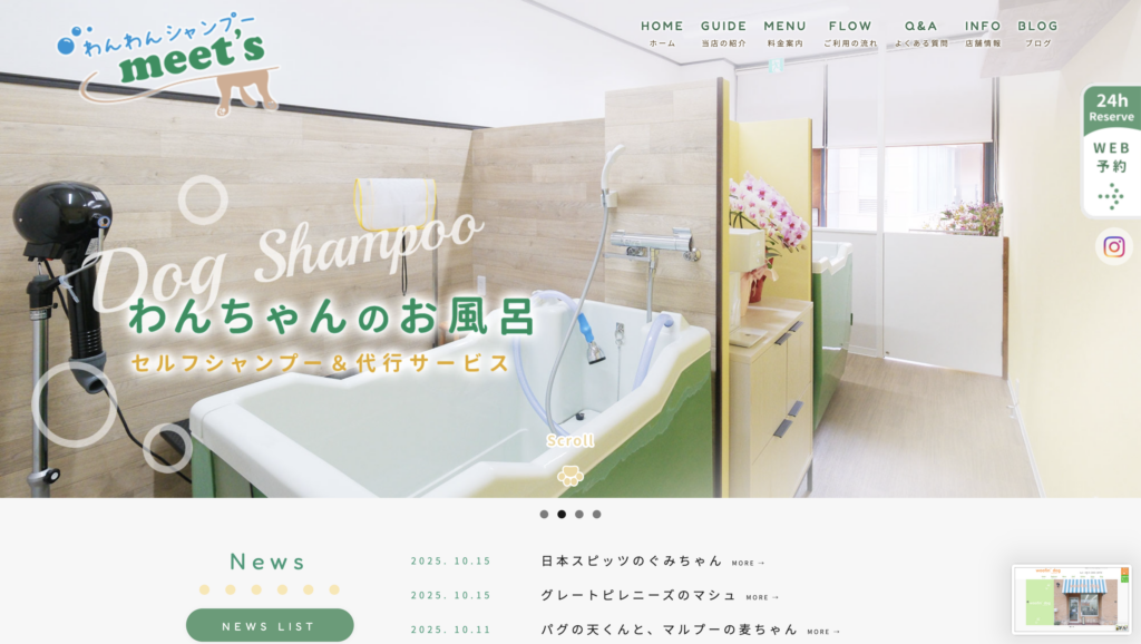 大型犬対応の設備を前面に出すことで、自宅で洗えない顧客のニーズを的確に捉え、シンプルな時間貸し料金で収益性を確保しています。