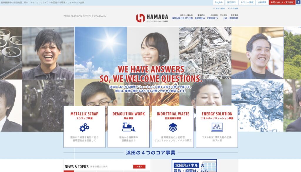 トップページには作業員の真剣な表情や、整然とした工場の様子が映し出され、「環境ソリューション企業」としてのプロフェッショナルな側面を強調している。