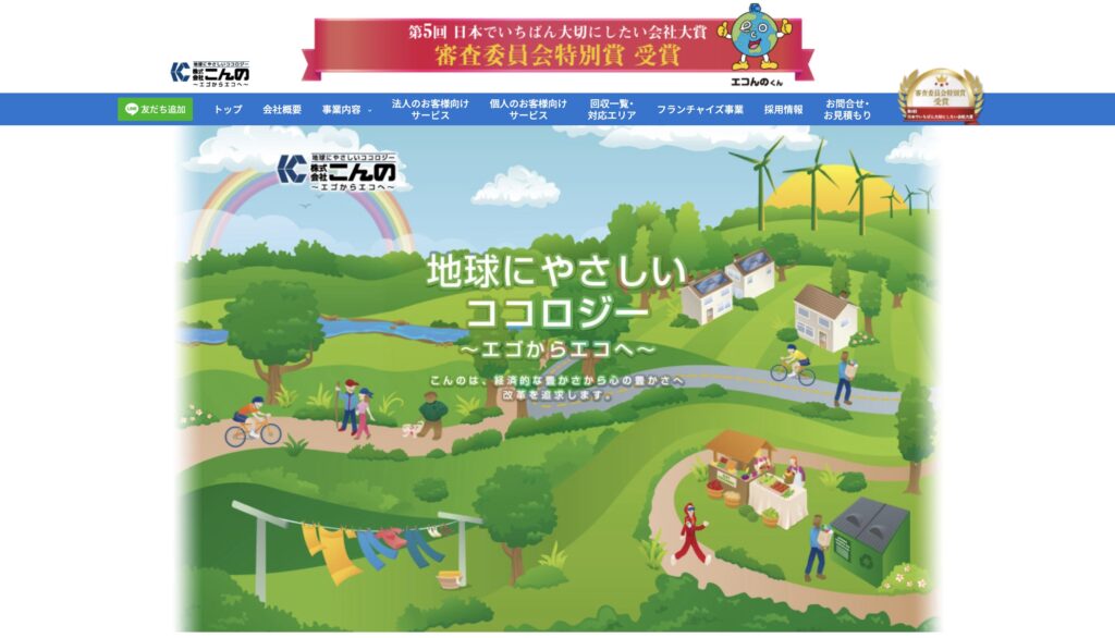 株式会社こんののウェブサイトは、「地球にやさしいココロジー 〜エゴからエコへ〜」という独自のスローガンを掲げ、全体的に柔らかく温かみのあるデザインで統一されている。