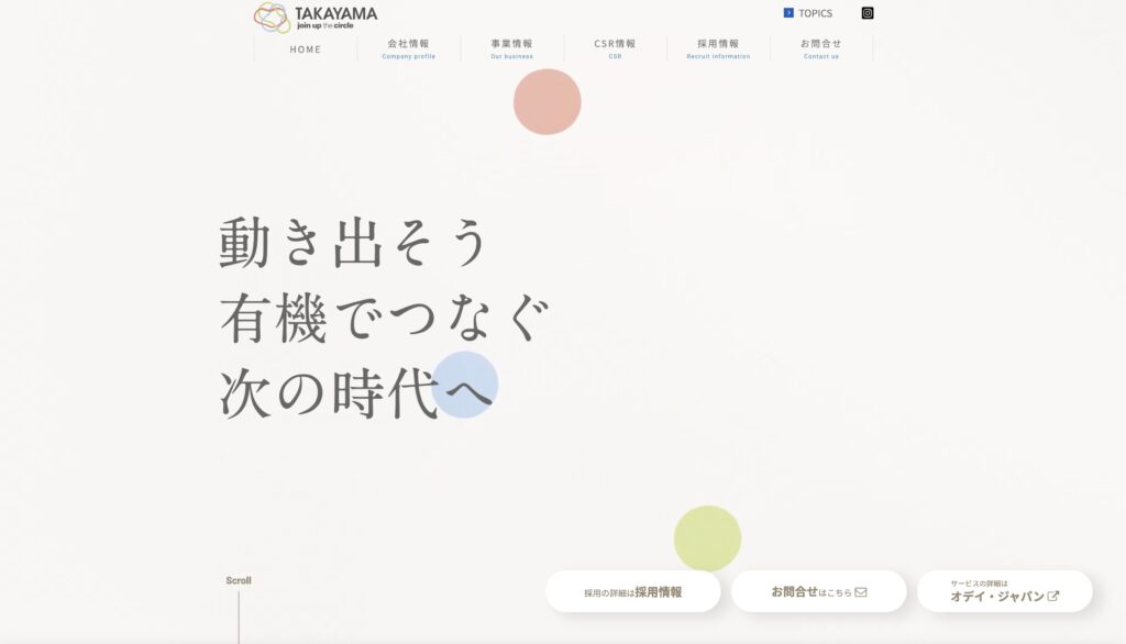 株式会社タカヤマのウェブサイトは、コーポレートカラーである鮮やかな緑(環境への配慮)と青(誠実さ)を基調とした、明るく活動的なデザインである。