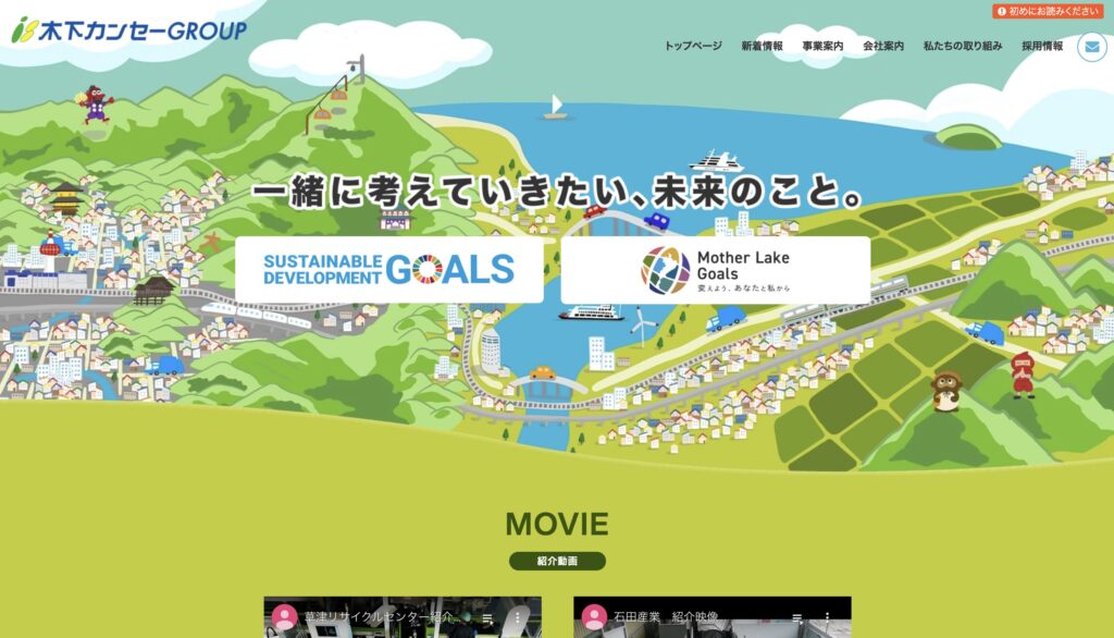 木下カンセーGROUPのウェブサイトは、環境への優しさを想起させる淡い緑色と、手書き風の温かみのあるイラストを組み合わせた、親しみやすいデザインが特徴である。