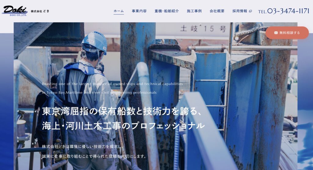 セクションの区切りには波打つような曲線ラインを取り入れて事業内容と世界観をリンクさせ、船舶や港湾クレーンなどの写真を背景に配置することで、同社の専門性とスケール感がひと目で伝わる構成になっています。