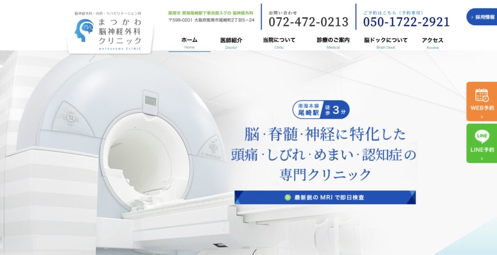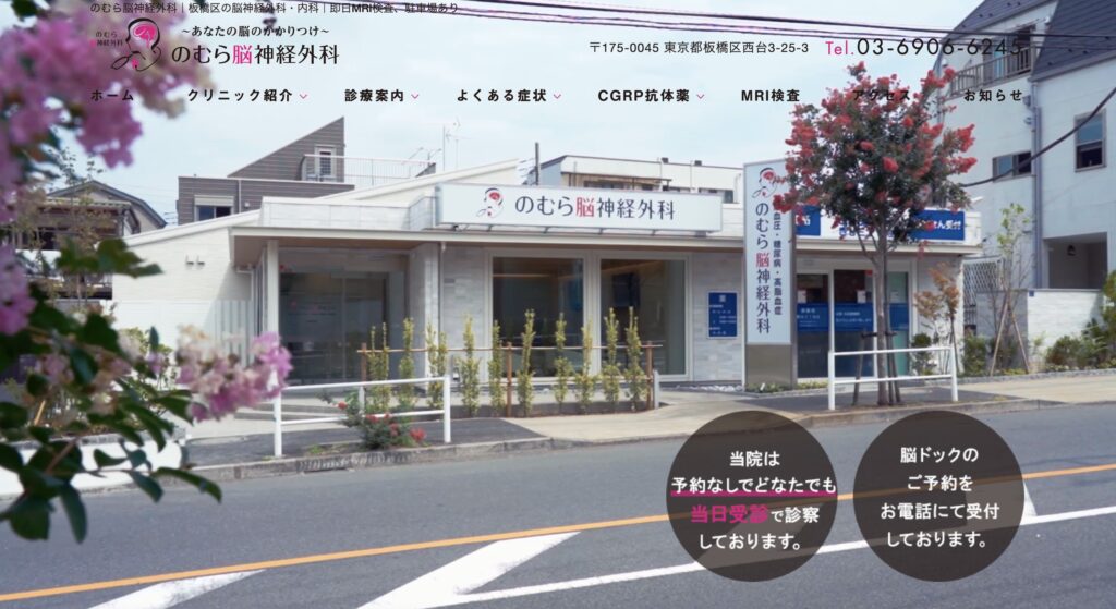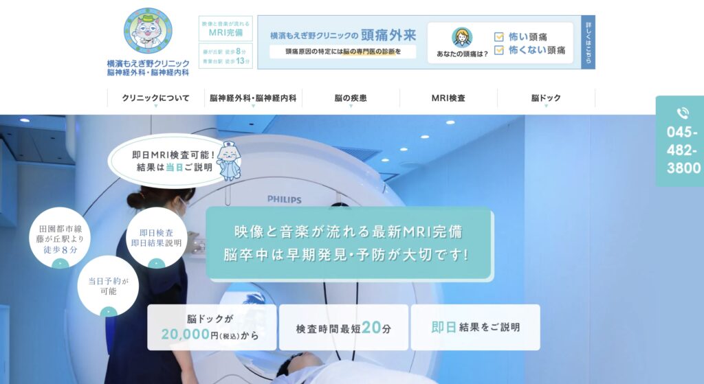 トップページに大きな文字で「予約なし・当日MRI」と掲げ、急な頭痛で困っている患者に安心感を与えます。