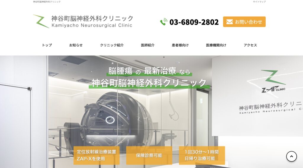 切らずに脳腫瘍を治す最新の放射線治療装置「ZAP-X」を前面に押し出したデザイン。