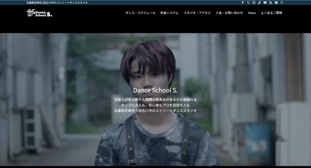 SNSフィードや動画をサイト内に埋め込み、常に最新のトレンドとスクールの熱量をリアルタイムに伝える、情報密度の高い構成です。