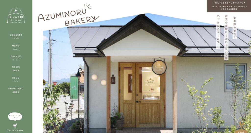 山や空の写真を背景に使い、空気の美味しい場所で作られたパンであることを伝えています。メニューが常に左側にあり、使いやすいです。