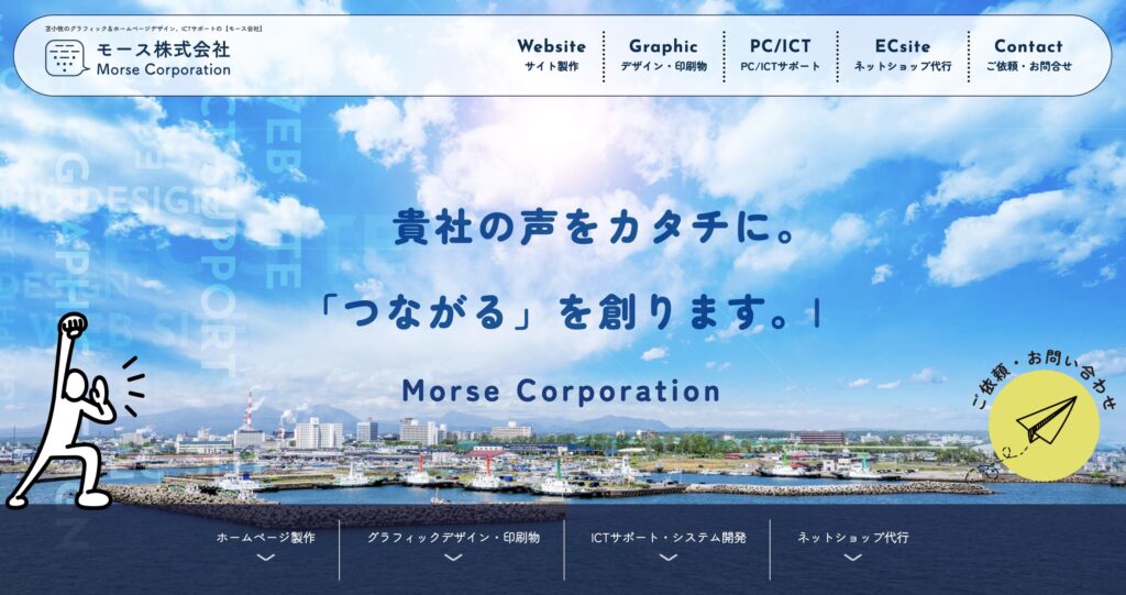 | モース株式会社 | 要問い合わせ | ・多くのウェブサイト制作実績がある ・Webサイトだけでなく、ロゴや名刺など印刷物も含めた一貫デザイン対応可能 ・サイト制作に加え、PC・スマホの設定・修理や社内システム開発などICT面のサポートも提供 | Webサイトだけでなく、ロゴや名刺など印刷物も含めた依頼をしたい人 |