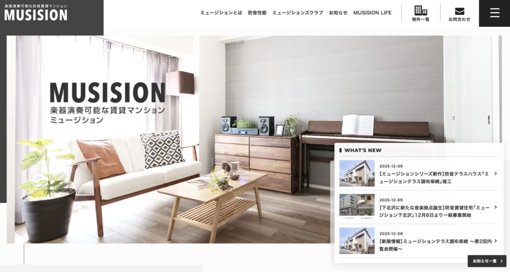 防音性能という「機能」とおしゃれな暮らしという「情緒」を、洗練された書体と高品質な写真で両立させ、ターゲット層の感性に響く作りです。