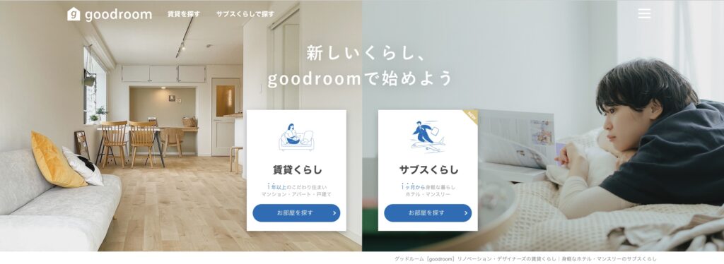 不動産サイトとは思えないクールなロゴや雑誌の表紙のようなトップ画像が特徴。