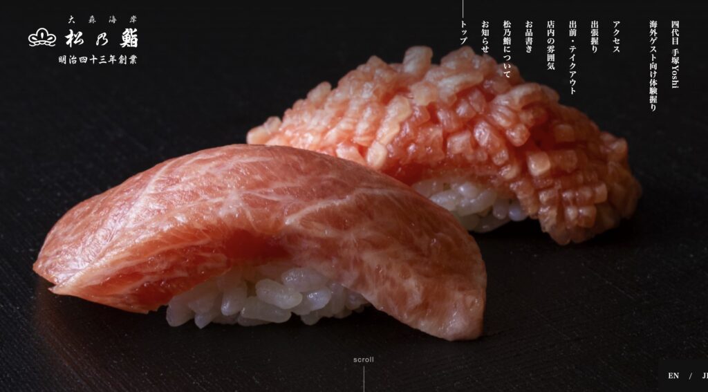 トップ画面では、職人の手元や新鮮なネタをダイナミックな動画で見せ、ライブ感と信頼感を醸成しています。