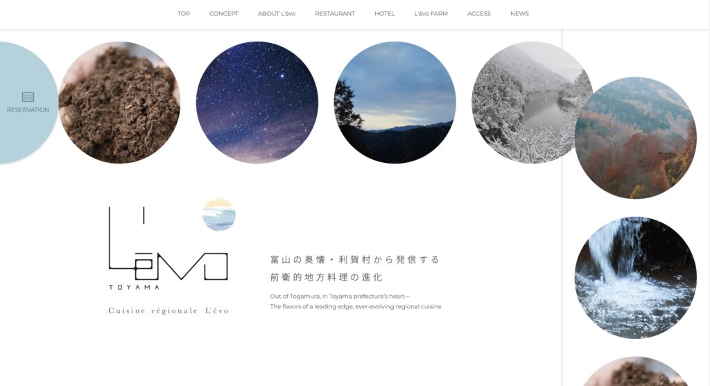 単に料理を見せるだけでなく、その背景にある「自然」や「生産者」の物語を視覚的に伝えることで、「わざわざここまで足を運ぶ価値」を言葉以上に雄弁に語っています。予約を入れる前から旅が始まっているような高揚感を与える、体験重視のデザインです。