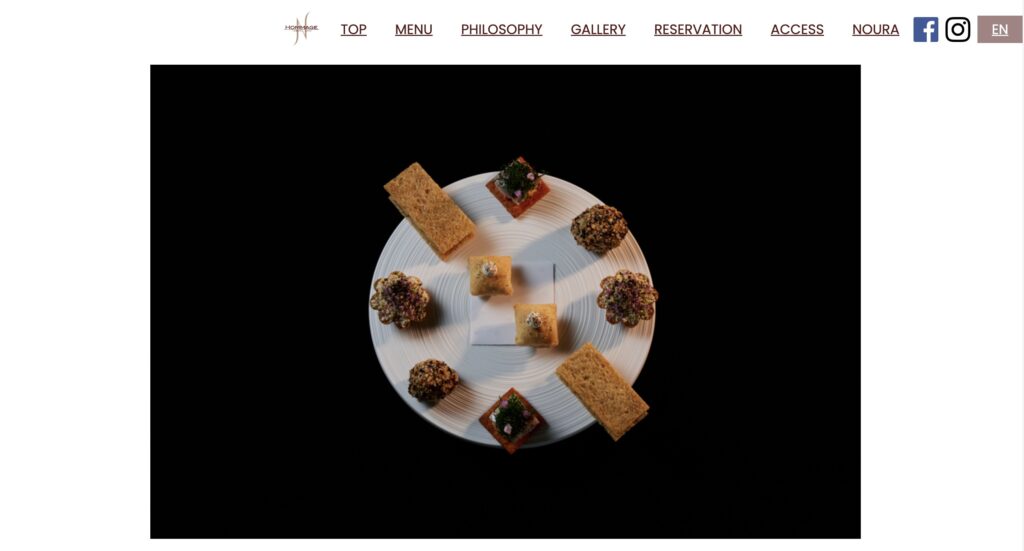 しかし、クリックしてページを開くと美しい料理が現れる仕掛けになっており、この「隠す」演出が、来店の際の驚きや感動を予感させるプロローグとして機能しています。