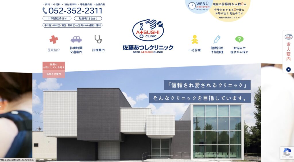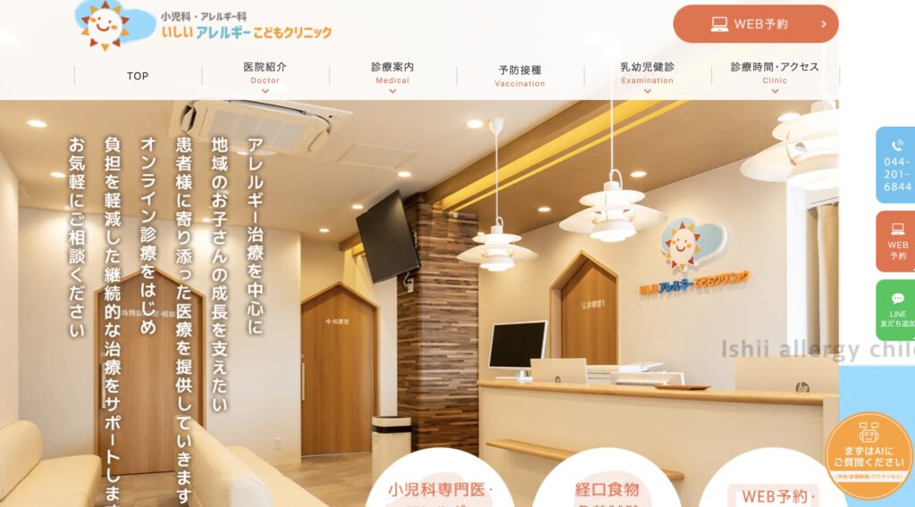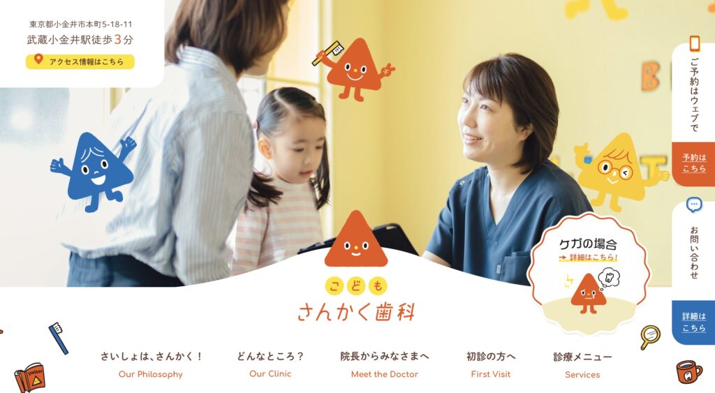Web予約や問診票へのアクセスボタンが常に押しやすい位置に配置されており、忙しい保護者の利便性を最優先に考えたUI(使い勝手)デザインが光ります。