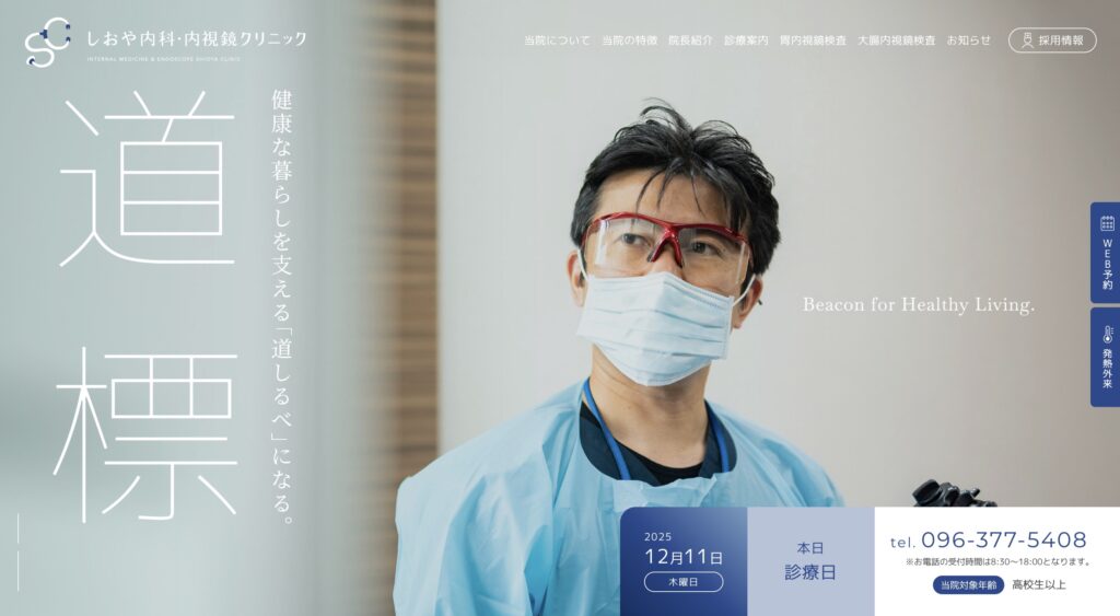 医師の紹介写真や院内の風景写真が非常に高品質で、自然光を取り入れた明るい雰囲気が画面越しにも伝わります。医療機関としての誠実さと、家庭的な温もりが同居するサイトです。