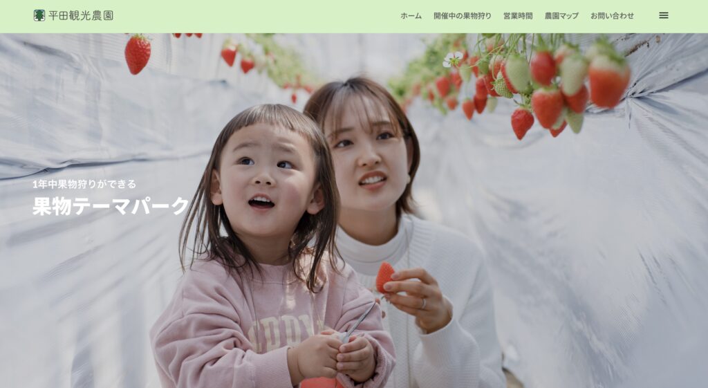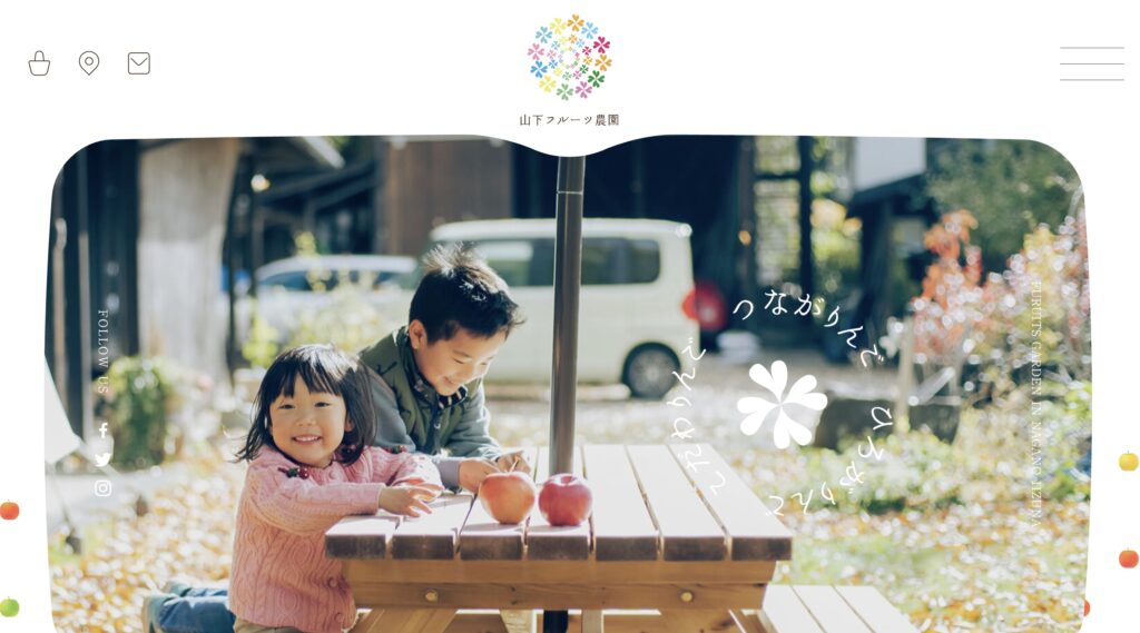 柔らかい色使いと手書き風のロゴ、そして家族や友人と果物を楽しむシーンの写真は、単に果物を売るだけでなく、農園で過ごす「時間」や「体験」を大切にしていることを伝えています。