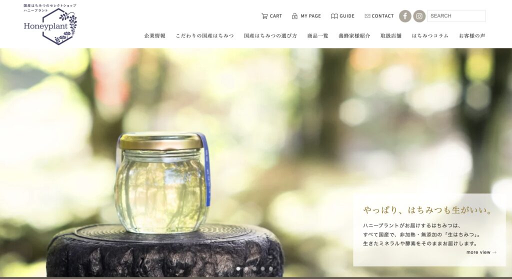 蜂蜜の瓶やパッケージのデザイン性の高さをそのままWebサイトにも反映させており、ギフト需要に応える高級感を演出しています。
