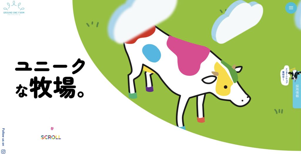 北海道の広大な牧場のスケール感を、画面幅いっぱいに広がる動画や写真でダイナミックに表現しています。