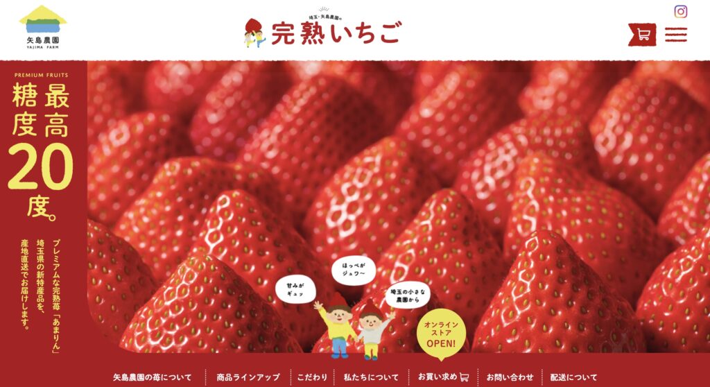 情報は必要最小限に抑えられ、直売所への案内とオンラインショップへの誘導が明確で、利用者を迷わせない潔い構成が、商品の自信を感じさせます。