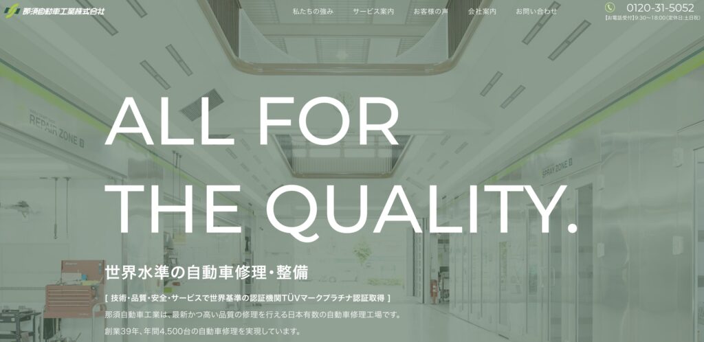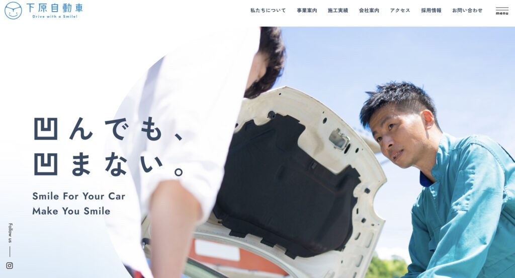 工場の規模感や設備をしっかりと見せつつも、ポップな色使いとモダンなレイアウトによって「古臭い修理工場」のイメージを完全に払拭しています。