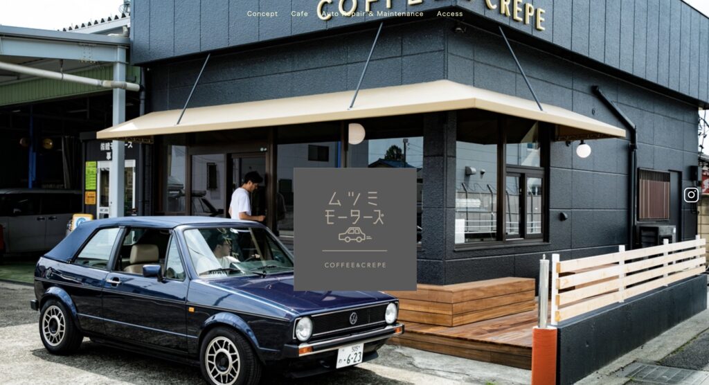 トップページには美味しそうなクレープやコーヒーの写真を配置し、一見するとお洒落なカフェのサイトに見えますが、スクロールするとしっかりとした整備工場の情報が現れます。