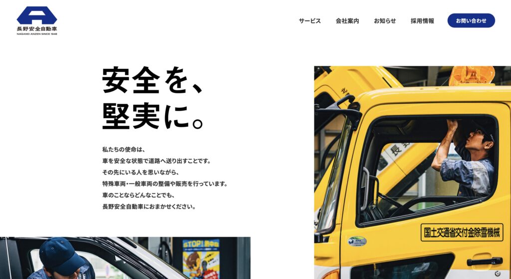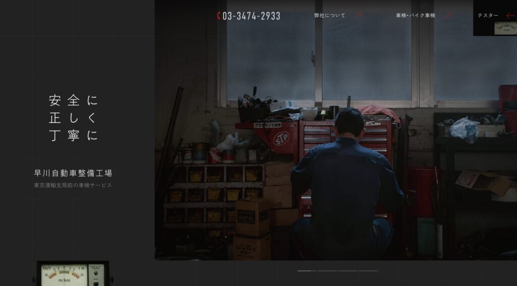 余計な装飾を削ぎ落とし、写真と文字のコントラストで魅せるデザインは、実直に整備と向き合う企業の姿勢そのものを表しているようで、非常に説得力があります。
