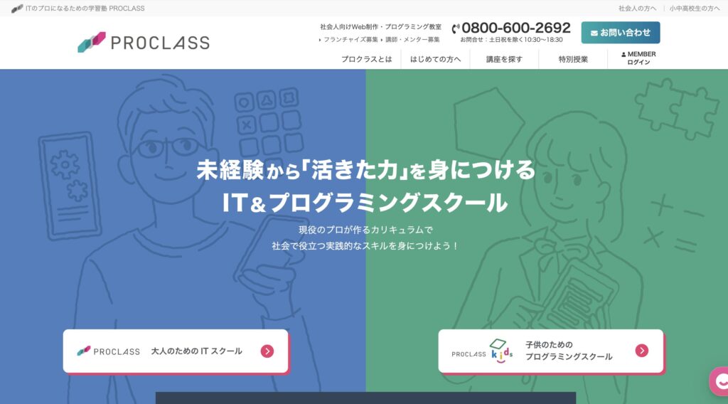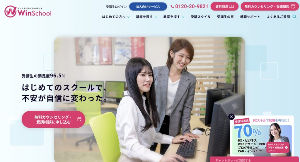 白と青を基調とした清潔感あふれる配色は、企業研修も手掛けるスクールとしての信頼性の高さを物語っています。