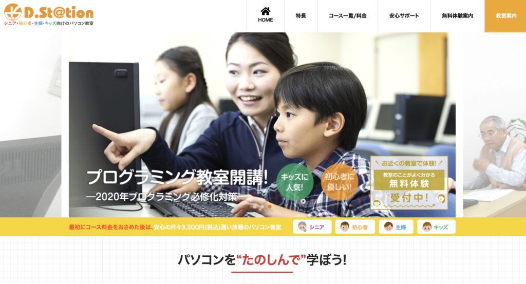 家電量販店内にある利便性と、ジュニア(プログラミング)からシニアまで幅広い世代に対応したコース案内が整理されており、家族で通える信頼感を醸成しています。
