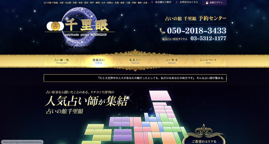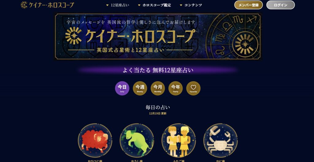 予約機能よりも「毎日の占い」という読み物を読ませることに特化しており、ファンが毎日訪れたくなるような、ブログやメディアサイトに近い構成が特徴です。