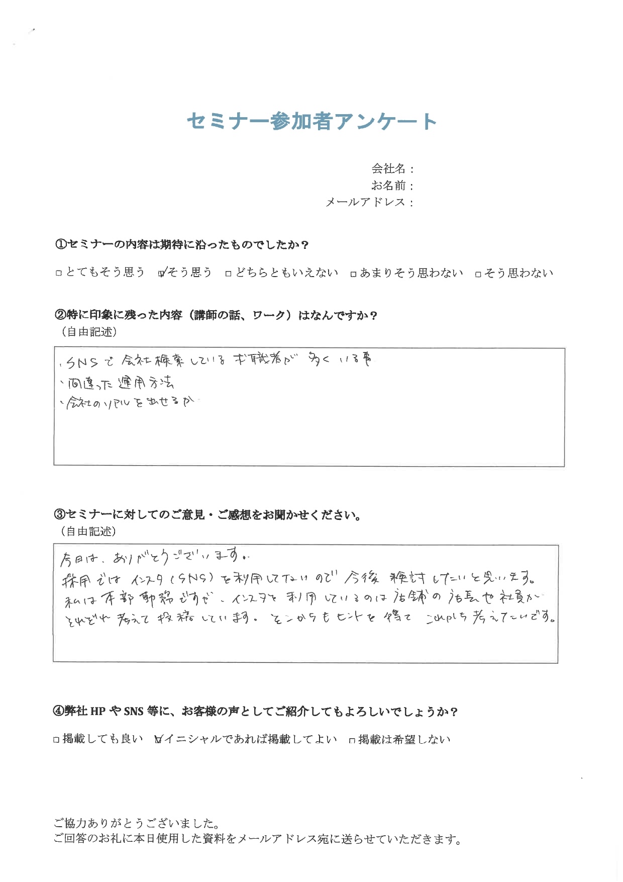 自社主催の「フォロワー87人でも2名採用したSNS運用セミナー」に参加された、株式会社F様からアンケートをいただきましたので掲載いたします。