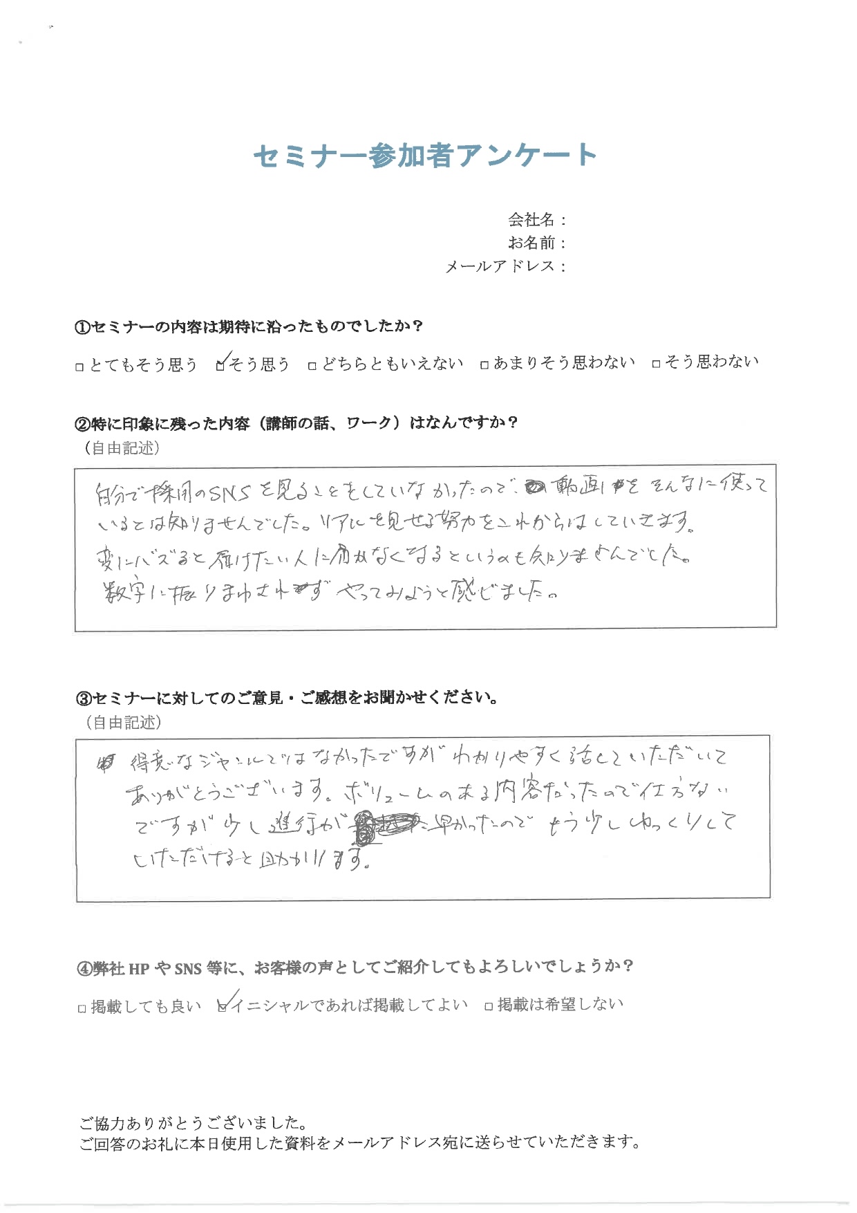 自社主催の「フォロワー87人でも2名採用したSNS運用セミナー」に参加された、株式会社S様からアンケートをいただきましたので掲載いたします。